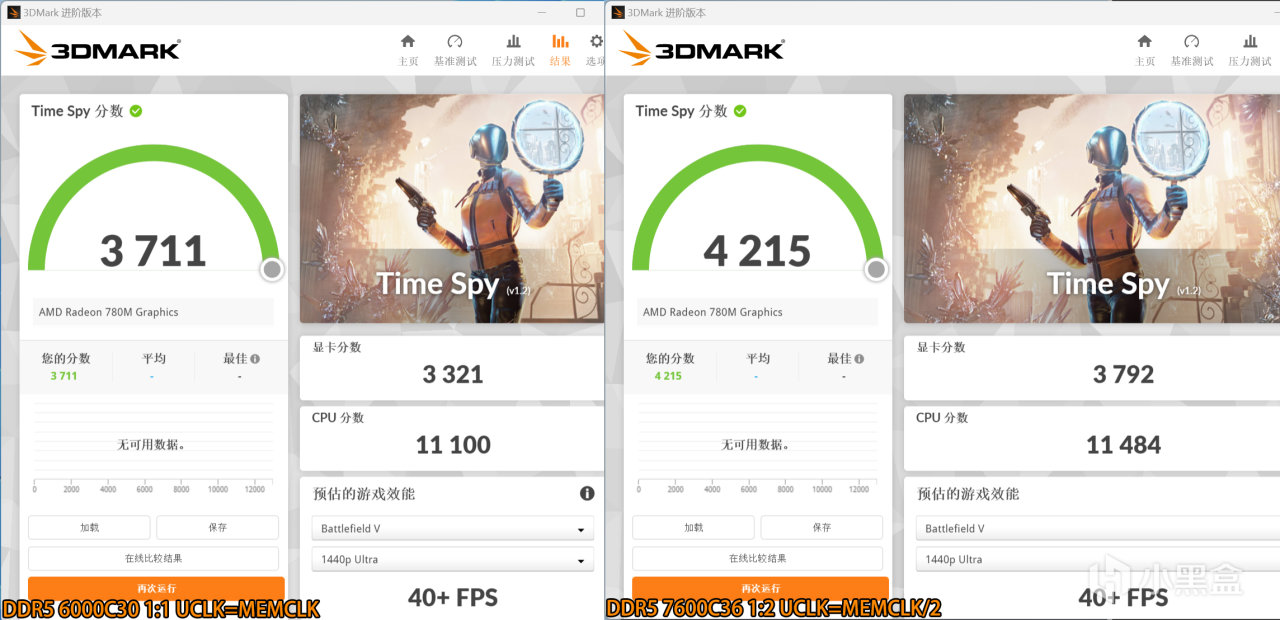 銳龍7 8700G(Radeon 780M)+DDR5 7600C36 1:2 Time Spy得分爲3792,相比前者提升14%