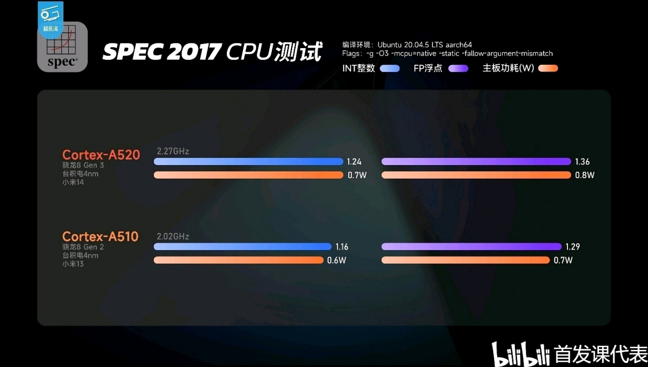 ❷FP浮点:Cortex-A520(1.36分/0.8瓦),性能提升约5.4%,功耗提升约14%;
