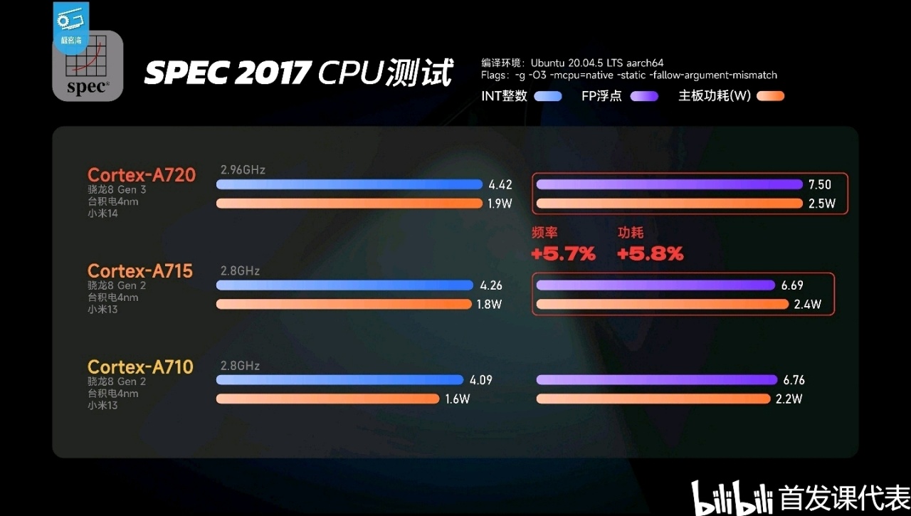 ❷FP浮点:Cortex-A720(4.26分/1.8瓦),性能提升约12.1%,功耗提升约5.8%;