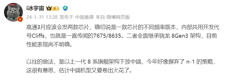 2 月 1 日消息, 据数码闲聊站爆料,SM7675系列(骁龙7+Gen3)样片,采用台积电四纳米打造,配备有骁龙8Gen3同款CPU性能核心(X4超大核/A720大核/A520小核),安兔兔极限跑分170万左右,中端性能杀手!