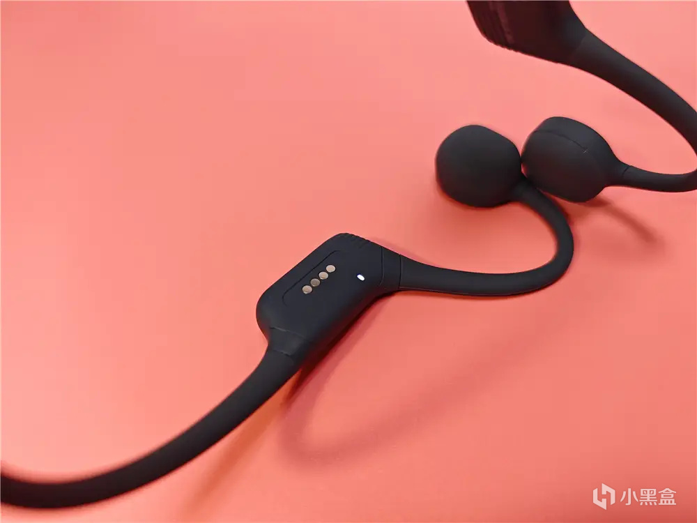 在耳机左侧模块内部印有产品参数介绍,右侧模块内部设有磁吸式充电触点和状态指示灯,通过指示灯可以查看连接状态和电池电量。