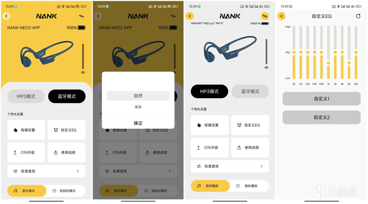 为了带给用户更自由的耳机使用体验,南卡Neo2骨传导耳机支持接入手机APP,通过APP查看耳机电量,支持滑动调节音量,一键可以切换MP3/蓝牙模式,支持按键、EQ自定义,音效调节轻松换,一键切换低延时/音乐模式,让耳机操控更方便。用户轻松打造具有自己风格的专属耳机,还能够对耳机的固件版本进行升级,不断优化自己的使用体验。