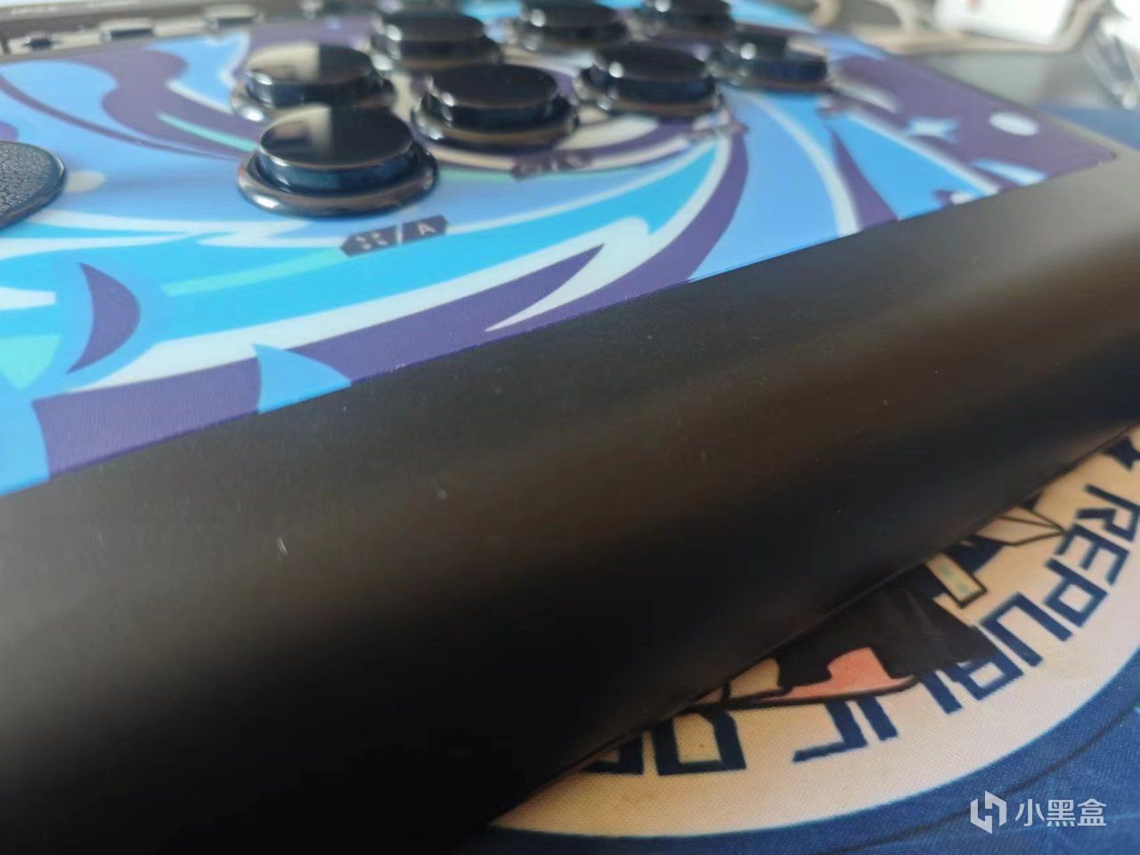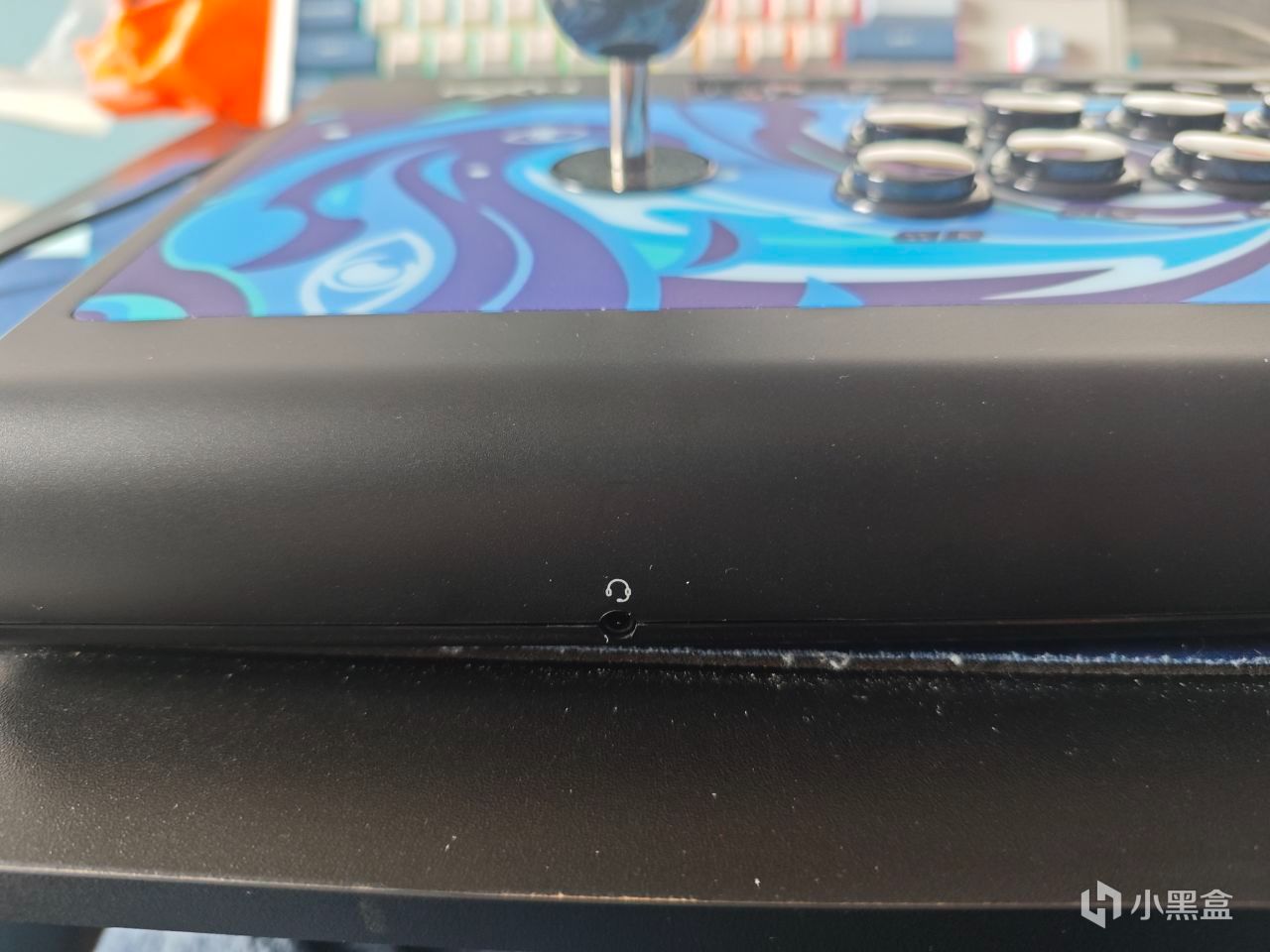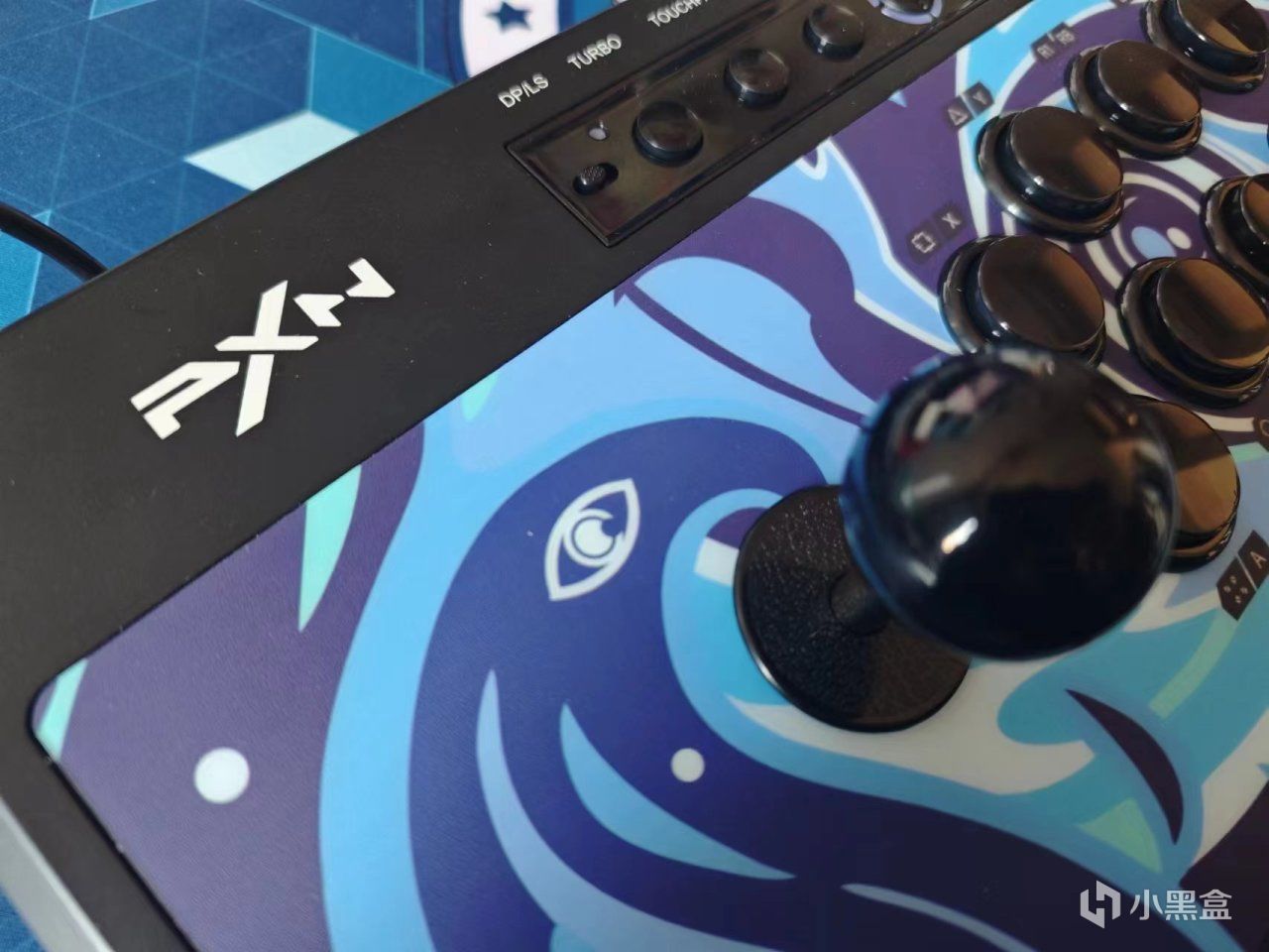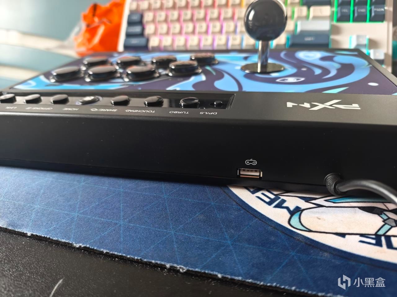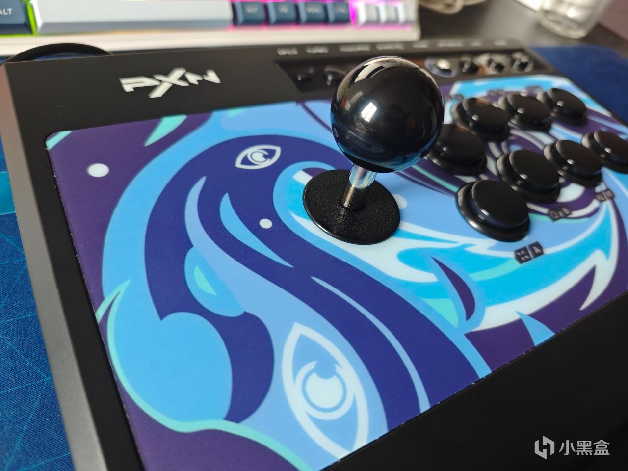 摇杆和键位都是黑色的,里面是青轴,2MM级触发反馈,70g触发,5000万次寿命。段落的敲击感,轻量触发更迅捷,打游戏手感非常爽,尤其是这种街机游戏。