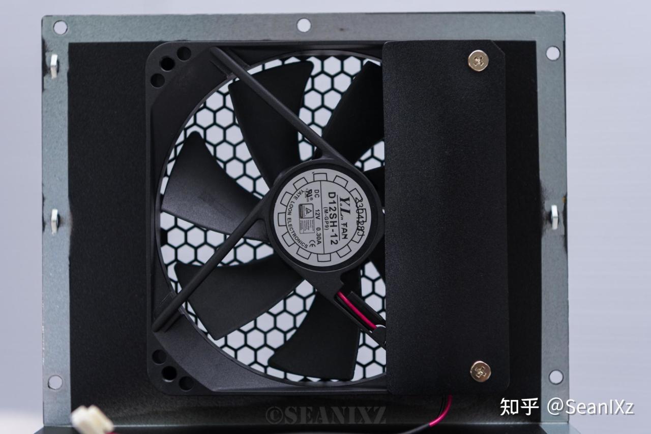 最后看了眼风扇,带有一个导流片设计,可以集中一下风量,风扇是悦伦的D12SH-12,12V0.3A,风量还可以,属于静音定位。