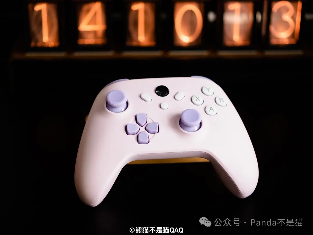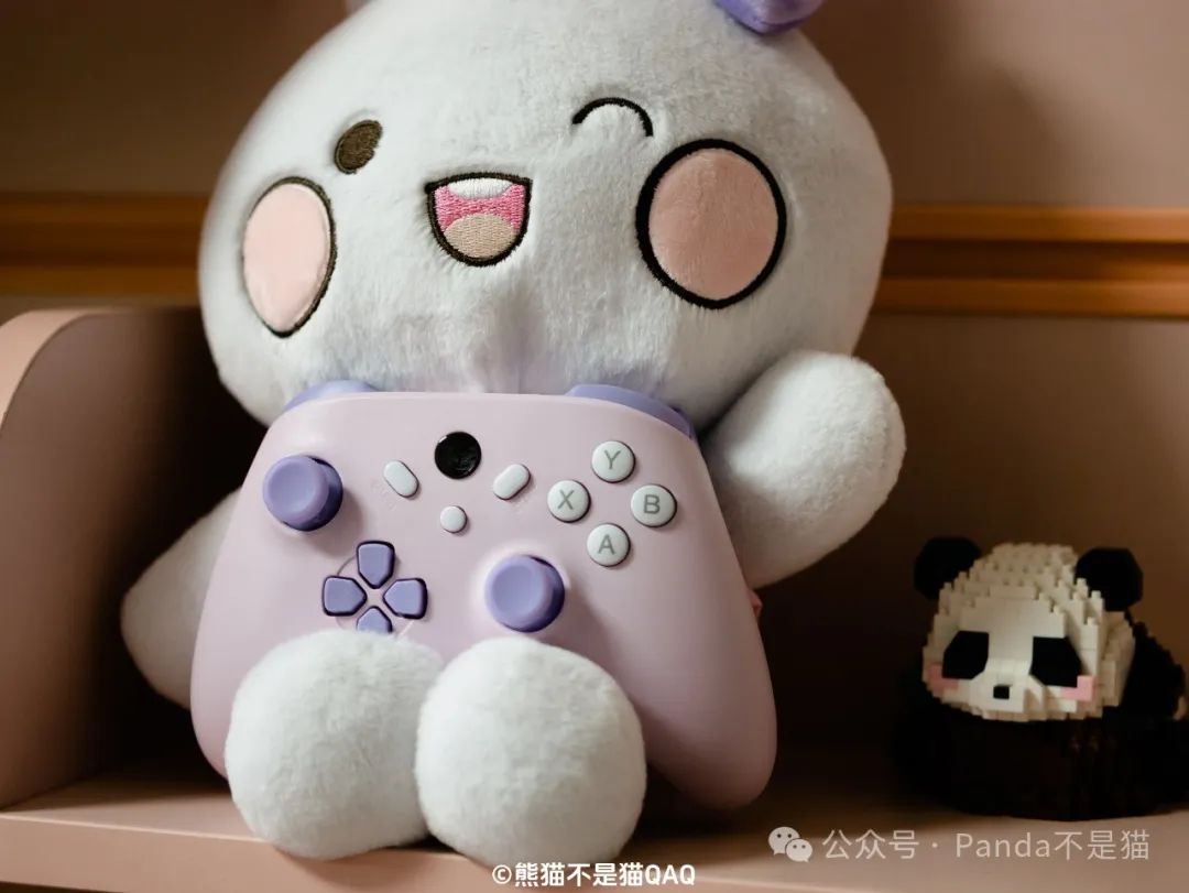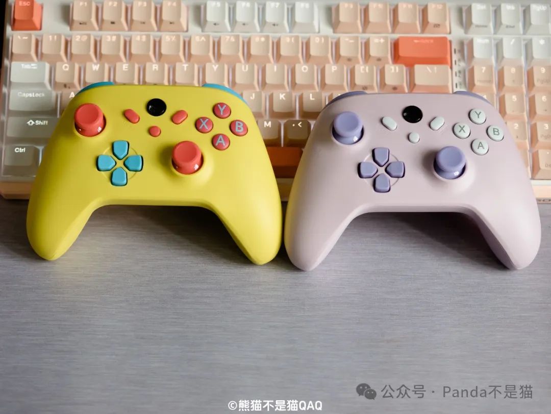两款手柄两种不同的配色,一款是近年来很流行的多巴胺配色,另一款则是紫粉配色。多巴胺配色是我女儿的选择,当时我给她展示了手柄的图片,对于一个两三岁的小女孩来说,多巴胺这种充满活力的颜色自然是最吸引她的。而紫粉配色则是我妻子选的,色调充满了少女气息。