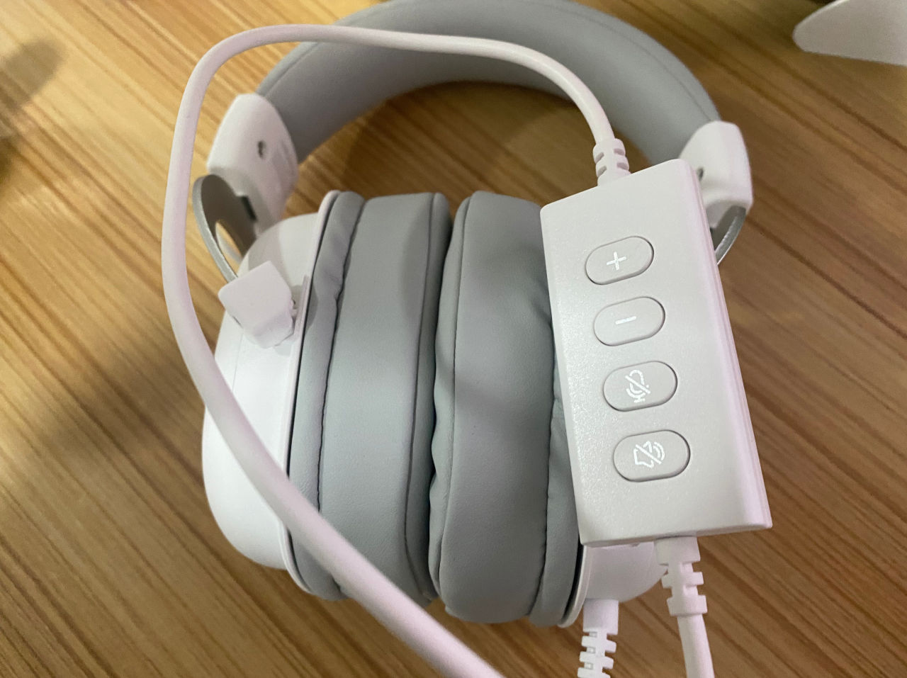 耳机整体呈白灰配色,机身、麦克风、数据线洁白如月,耳罩、拉伸框架、顶部银灰如雪,白灰相间十分协调,颜值十分在线。
