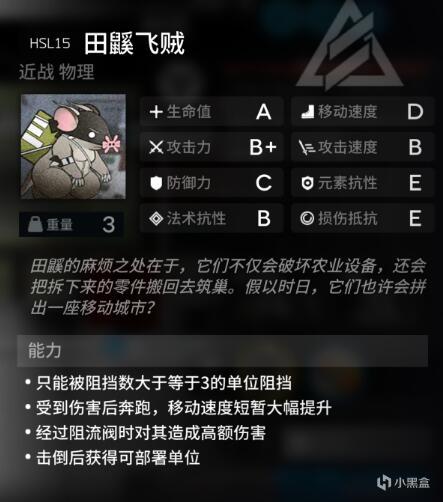老鼠泥头车。优先攻击阻流阀,需要挡三,属性一般但是血量略厚移速快,大概一秒一格半的移速。