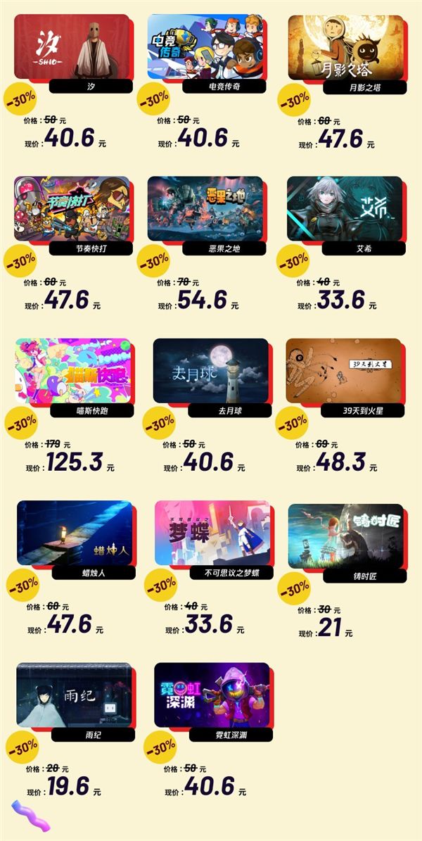 7折遊戲包括《馬力歐卡丁車8豪華版》《妖怪手錶4強化之章》《超級馬力歐奧德賽》《舞力全開無限版》《驚奇劍士》《硬核機甲》等等。