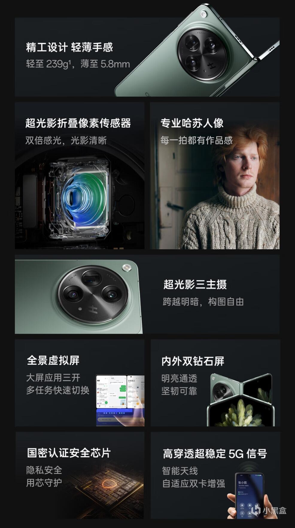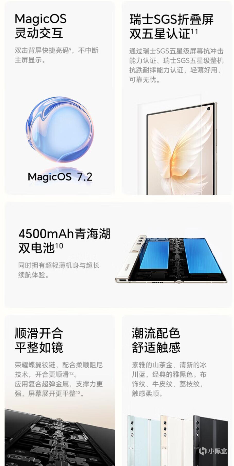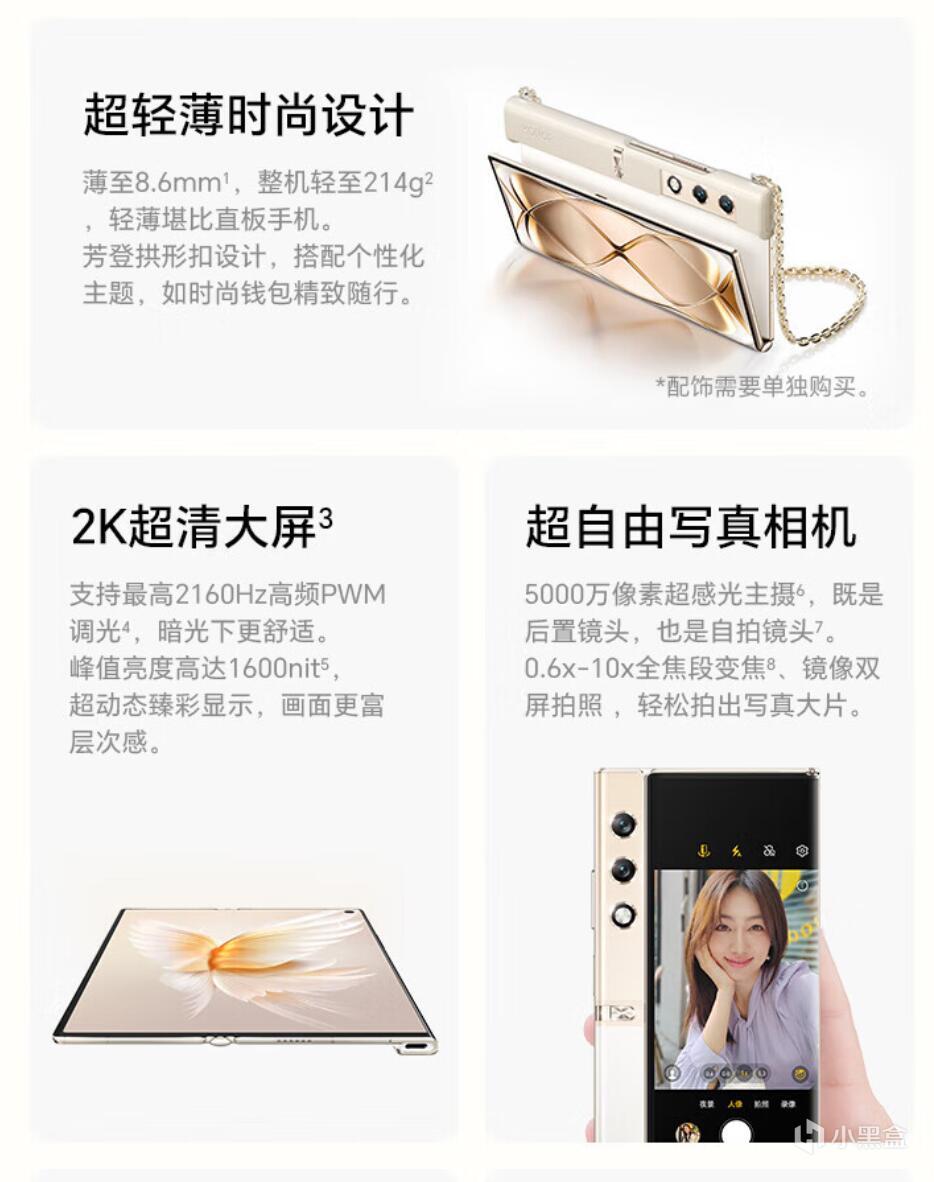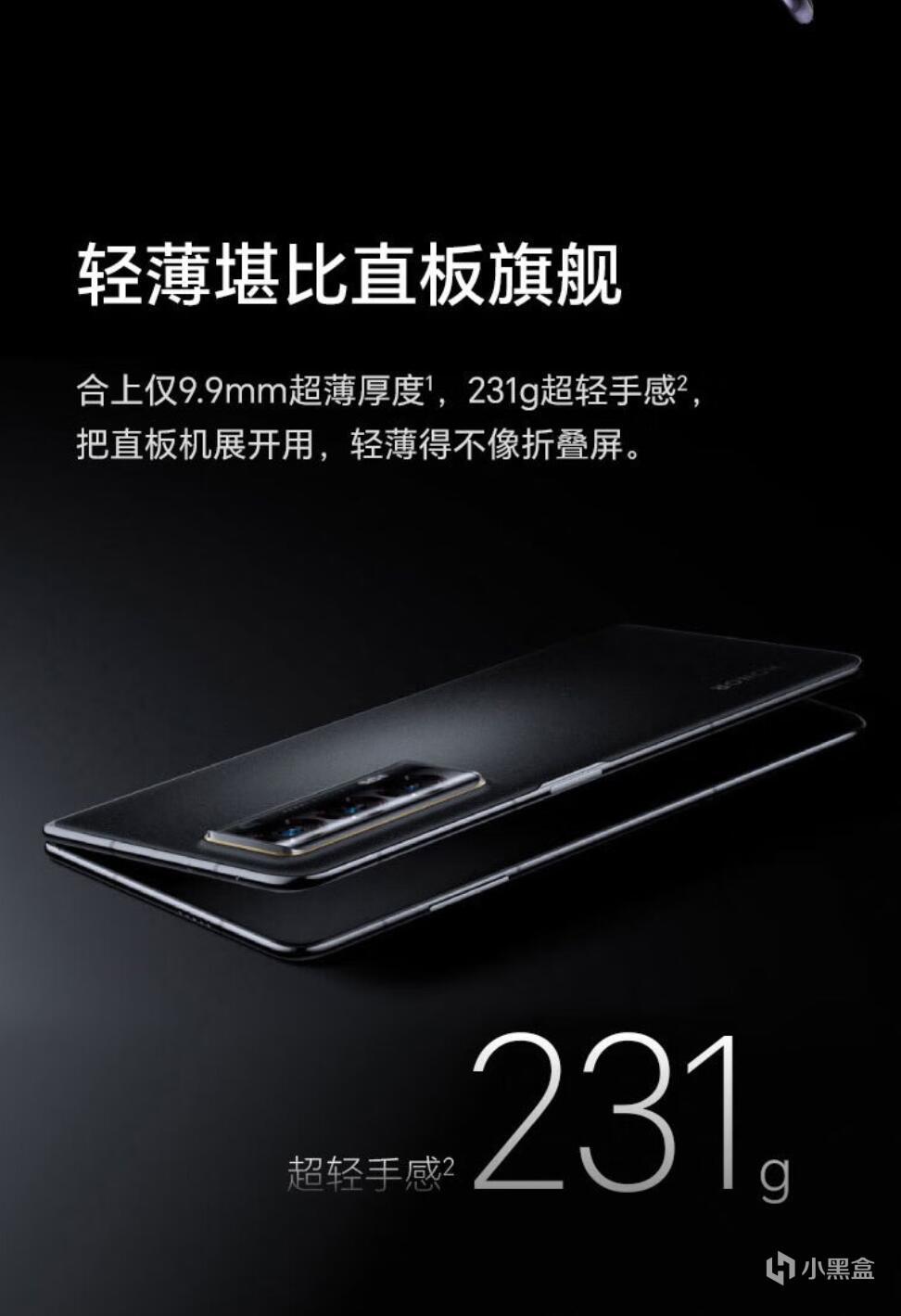 沉积了半年,到了2023年7月,荣耀打响了下半年热闹的折叠屏市场第一炮。荣耀Magic V2是目前市面上最薄的大折叠屏、第二轻的大折叠屏(最轻的不算特殊的V purse,是V2的小弟VS2),为了这个轻薄其他配置都进行了压缩,没有无线充电,快充也是66W的普通水平,不过青海湖电池还是牛逼,在9.9mm的机身里塞下了5000mAh的大电量,除此之外亮点不多,摄像头自己都不好意思吹,再加上荣耀一贯“扫码级”的摄像头调校,比较适合商务人士,毕竟荣耀作为当年华为的小弟如今的......养子,Magic OS也继承了鸿蒙系统对折叠屏优秀的适配,而且荣耀品牌在商务人士里的架子还在,抢不到电子茅台的商务人士可以考虑,确实是非常轻薄堪比直板机的手感。