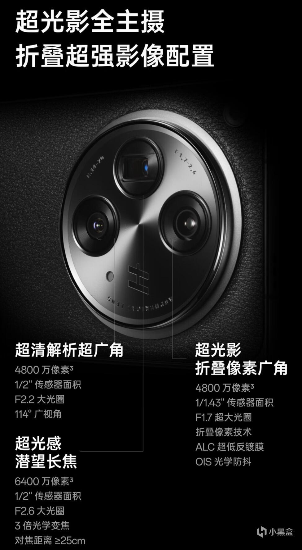看这个巨大的摄像头Deco就知道,N3在影像上不玩虚的,Deco凸起几乎达到了传统1英寸影像旗舰的水平,主要就是为了塞下这颗1/1.43英寸的LYT-T808,之前仅在SONY自家手机上出现过的好东西,也就是IMX888的马甲,注意这个东西和后来出的LYT-808不是一个玩意,T808是目前市面上唯一的双层晶体管传感器,日常影像素质仅次于IMX989这样的1英寸传感器机型;除此之外3倍潜望长焦OV64B和超广角IMX581也都是影像旗舰们的标配,长焦光圈也有F/2.6,不算小了,说Find N3是目前折叠屏里影像第一,绝对没问题!