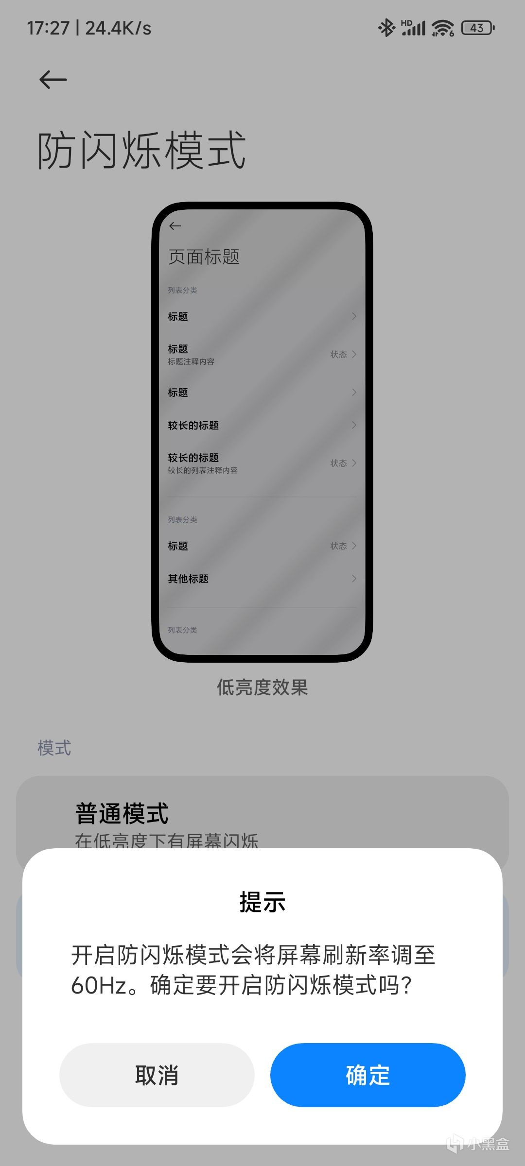 比如在小米12S上,默认是无法同时开启高刷新率和防闪烁模式的。