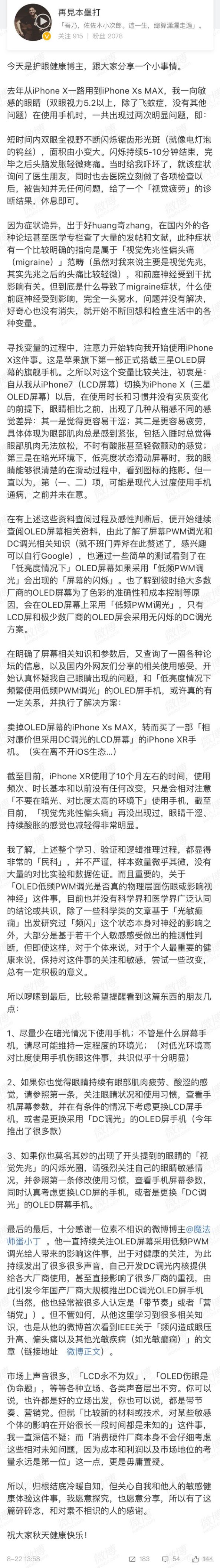 以这位博主为代表,之后,越来越多国产手机厂商听取用户意见,加入了“防闪烁模式”,虽然牺牲一定屏幕显示效果,但是可以在低亮度下使用DC调光。