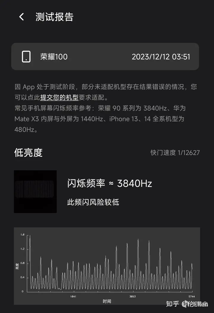 硬件上,荣耀100的屏幕低亮度下为3840Hz的超高频PWM调光。
