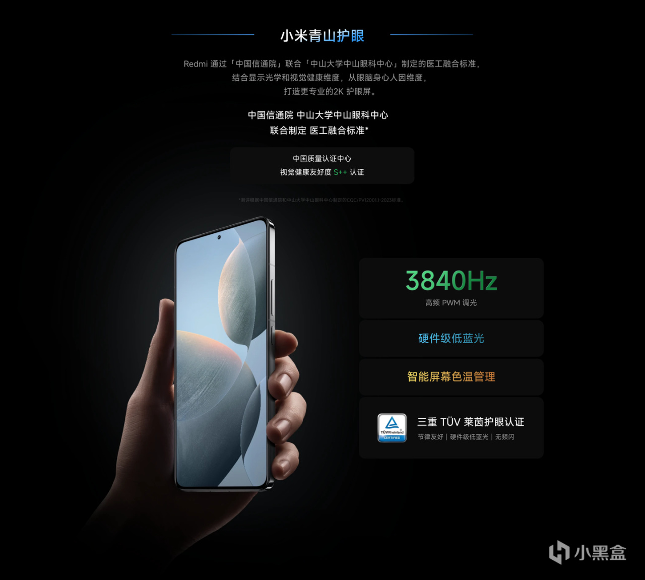 而Redmi也不堪示弱,在Redmi K70系列上,通过中国信通院、联合中山大学中山眼科中心制定的医工融合标准,打造了“小米青山护眼”解决方案,首发了一块支持3840Hz超高频PWM调光的2K屏幕。