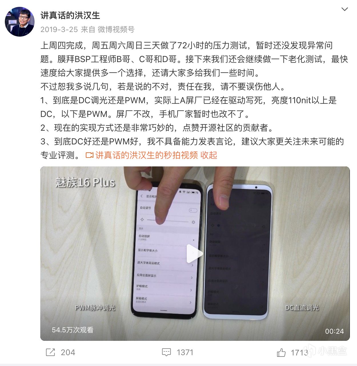 比如,开发了第三方手机内核刷机包,刷入手机后可以改变调光方式;开发了第三方app,原理是欺骗手机先用高亮度输出规避低频PWM调光,然后在上方覆盖一个黑色透明图层压暗屏幕亮度,从而达到低亮度改变调光方式的目的。
