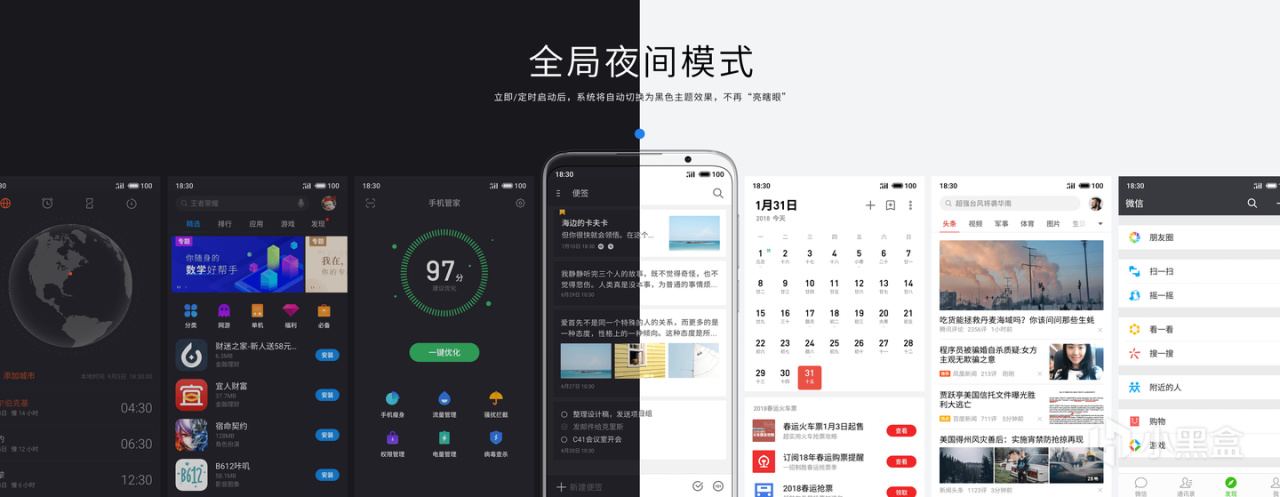 国产厂商在这点还是比较超前的,2018年的Flyme 7就加入了全局夜间模式,不过在第三方App上的实现相对粗暴——大多是靠解构界面元素,将背景单独处理,偶尔会出现兼容问题。