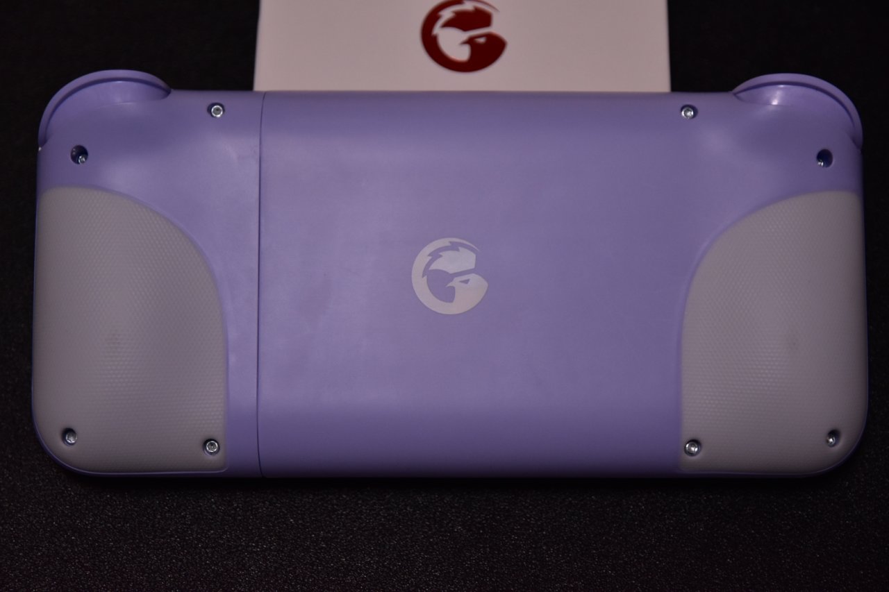 背部以紫色为主,握持的地方可以看到有胶垫,对比塑料纹理防滑效果更佳,虽然只有薄薄一层,但在同价位的电脑手柄都几乎没有使用胶垫的。