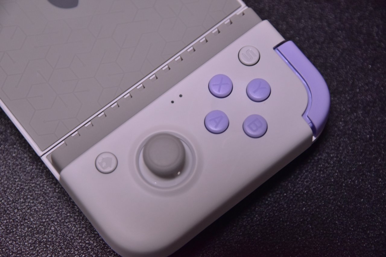 手柄没有延伸握把,整体呈现方形,按键摇杆看上去都十分的小巧,中间及两侧都有硅胶垫,用于保护保护手机,因为背部面积较大,所以可以更好的贴合手机,玩游戏时,手机会更加稳固。