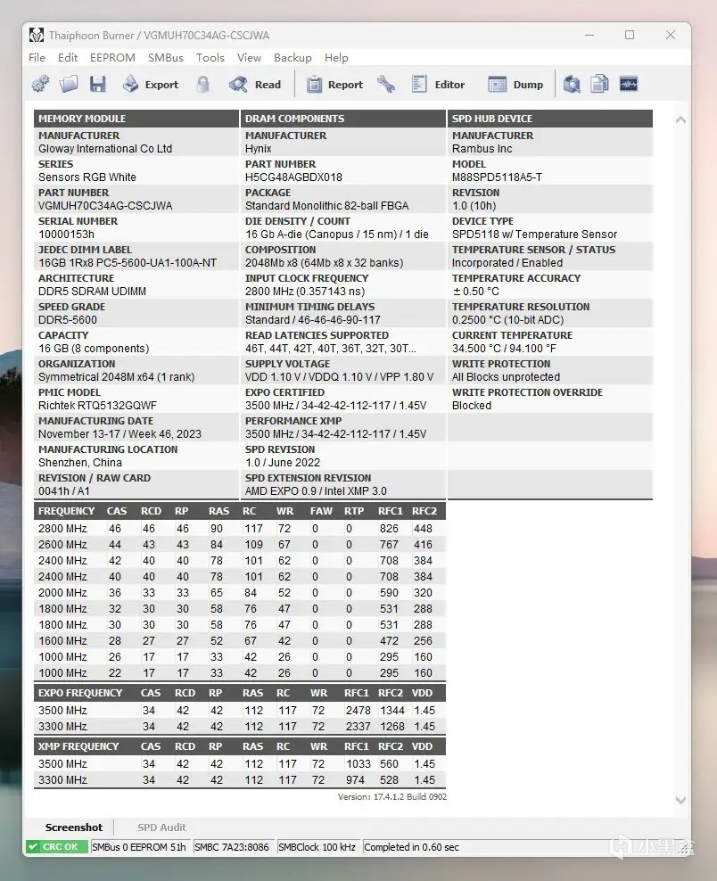 把台风软件升级成最新版本,就可以看到它采用的颗粒信息了,其中DIE DENSITY/COUNT选项中显示就是A-die,说明它就是海力士A-die颗粒,这款颗粒应该是目前最好的DDR5颗粒了,没有之一。此外还有一个海力士M-die颗粒,也是很不错的,在超频方面只比海力士A-die颗粒差那么一点点,表现很抢眼。而且人家还可以主打大容量,优势明显。至于三星,美光的DDR5颗粒,目前整体表现就比较差了,没一个能打的,所以现海力士只能自己和自己打了。