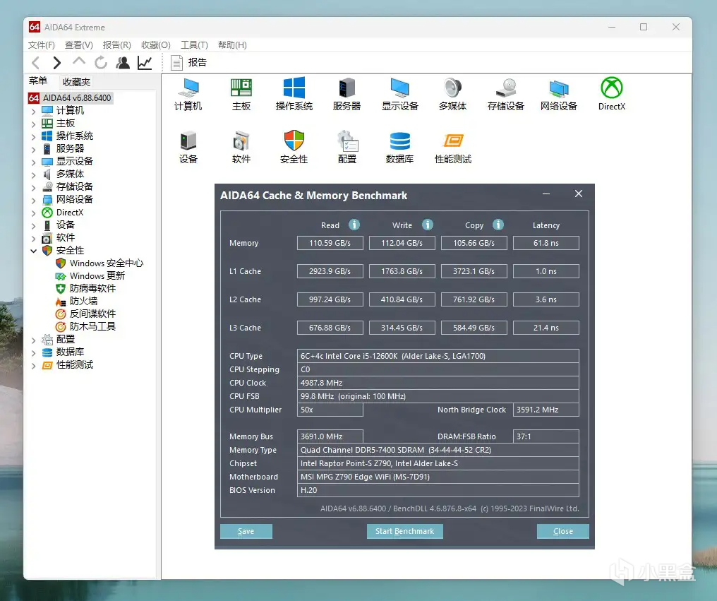 双内存条模式下,可以超至7400MHz,肯定有网友说,才超这么一点点根本什么用。之前我也说过,主要是我用的CPU和主板不行,给这款内存条超不了多少。7400MHz频率下,内存条的时序为34-44-44-52,在AIDA64软件的测试中,读取速度为110.59GB/s,写入速度为112.04GB/s,延迟61.8ns,不得不说超内存后,得分提升还是很明显的。
