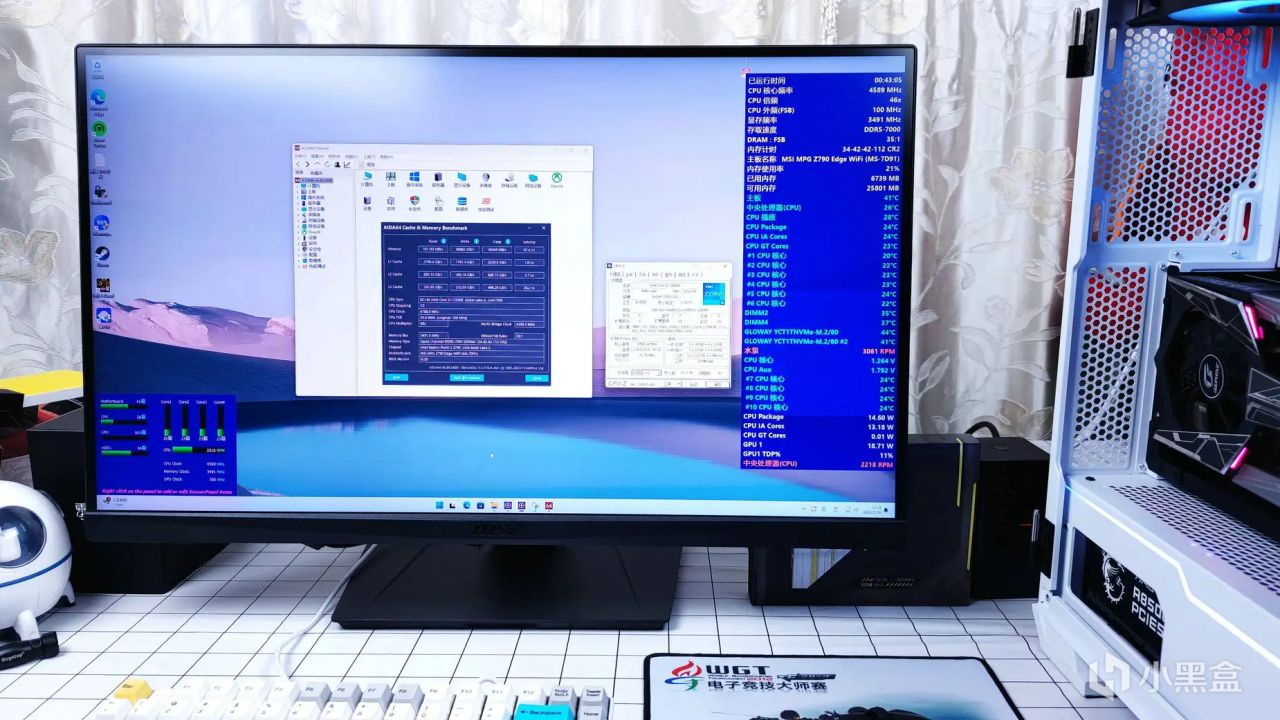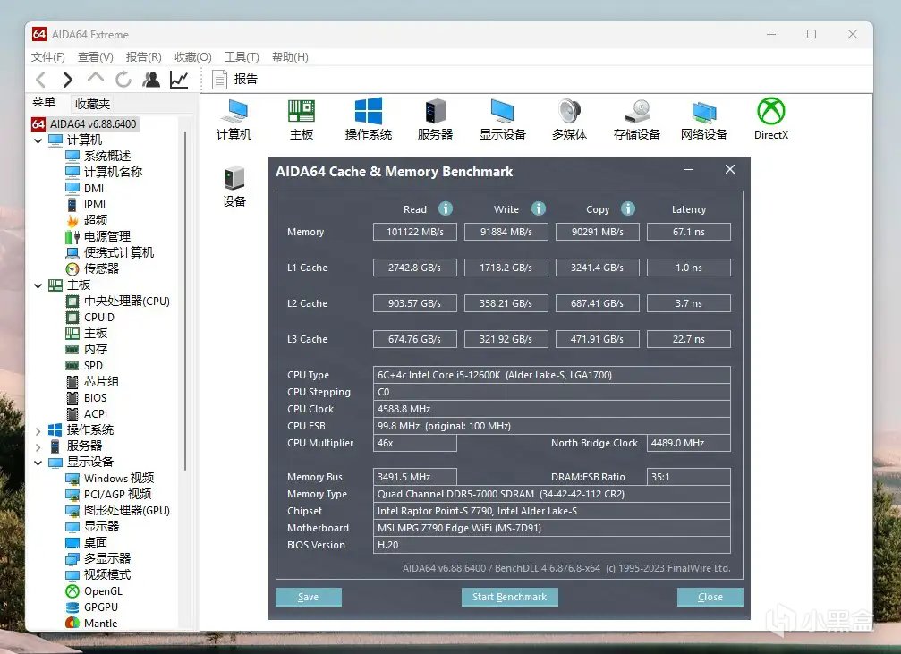开启XMP模式7000MHz频率,这时内存条的时序为34-42-42-112,在AIDA64软件的测试中,读取速度为101122MB/s,写入速度为91884MB/s,延迟67.1ns,性能与默频相比,提升幅度非常大。之前有些网友说DDR5内存连DDR4都不如的原因,就是它的默认频率太低,延迟太高,整体性能表现不佳,但现在这些问题,都已经解决了。