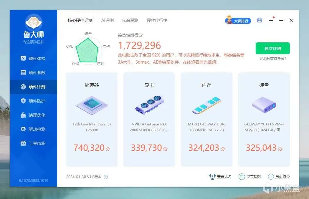 鲁大师得分展示,聊胜于无的跑分,不是很准确,但也能做一点点参考,其中内存项得分为324203分。