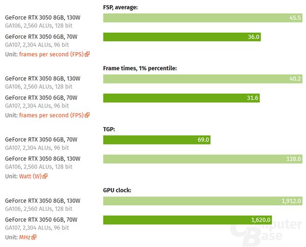 德国媒体ComputerBase测试了一款微星的万图师版本,发现在3DMark中它比RTX 3050 8GB慢了21-24%,《赛博朋克2077》游戏中平均帧率、1%最低帧都慢了大约21%。