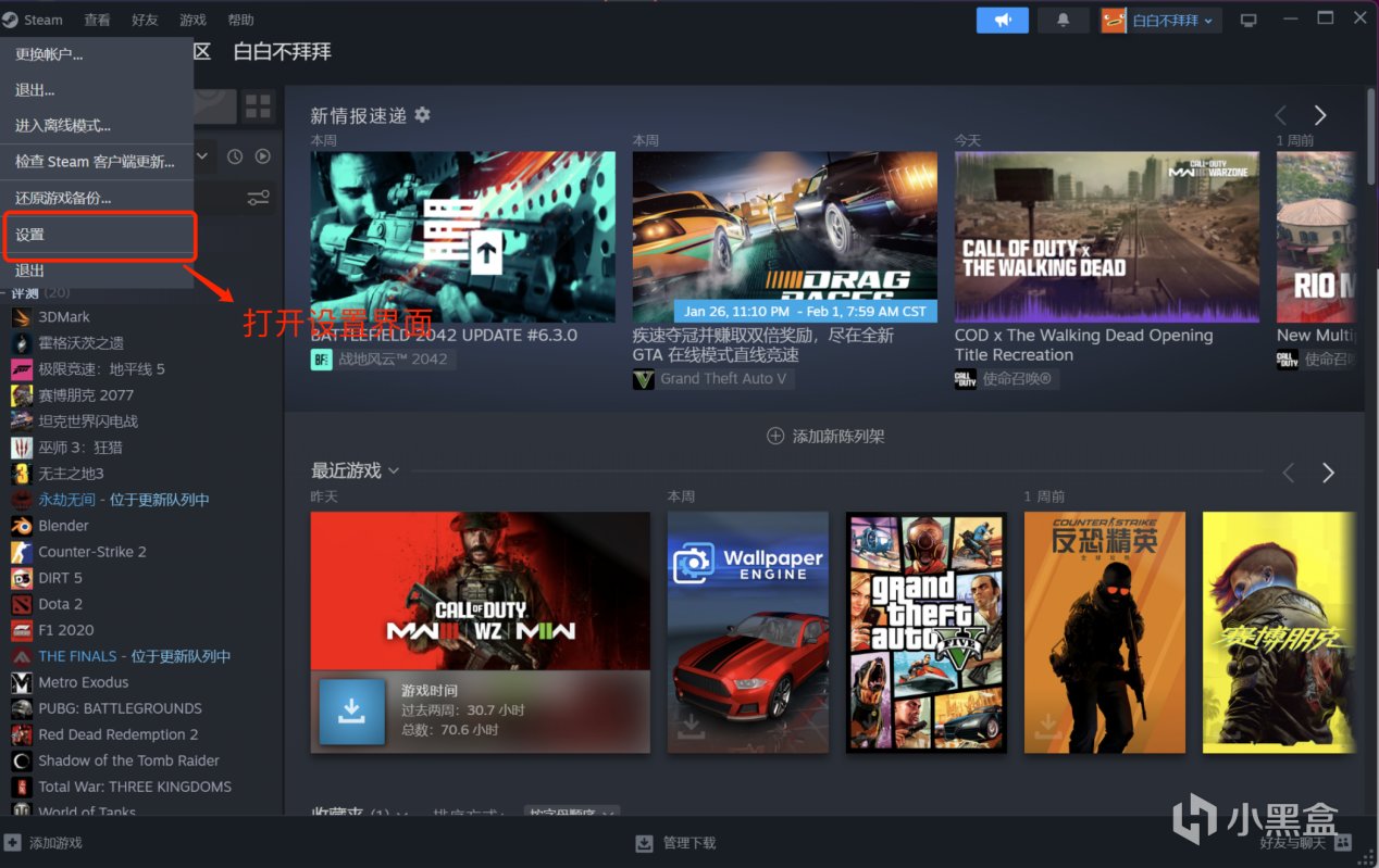 1、運行Steam,點擊左上角的“Steam”按鈕,然後在下拉菜單中選擇【設置】;