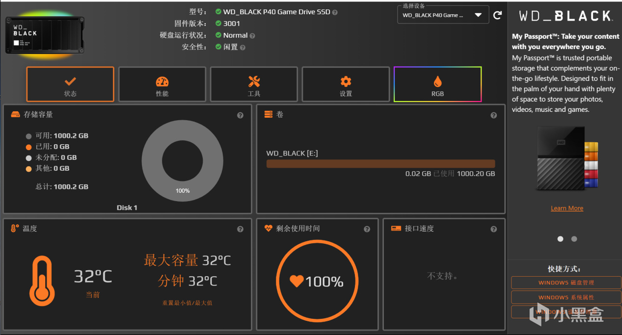 當WD_BLACK P40遊戲移動固態硬盤插入遊戲本時,默認點亮呼吸式的顏色漸變燈效,如果想定製更爲個性的燈效,需要安裝WD_BLACK Dashboard儀表板軟件。除了調節RGB燈效以外,儀表板還可以查看硬盤的基本信息,調節硬盤的性能,例如NVMe模式就要在這裏開啓。