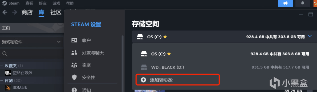 2、切換到左側存儲空間,點擊【添加驅動器】,就可以將硬盤添加至Steam中了;