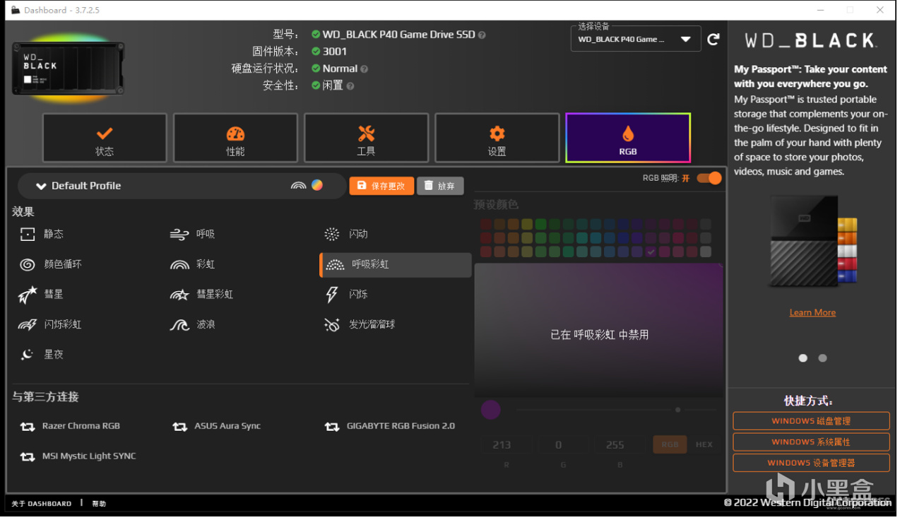在WD_BLACK 的 Dashboard的应用中,大家可以在电脑上直接调试自己喜欢的 RGB 效果与风格。除了系统预设光效外,WD_BLACK P40 游戏移动固态硬盘还能直接连接,诸如雷蛇 Chroma、华硕神光同步与微星和技嘉第三方厂商的光效控制软件,并与你的其他硬件保持统一光效。