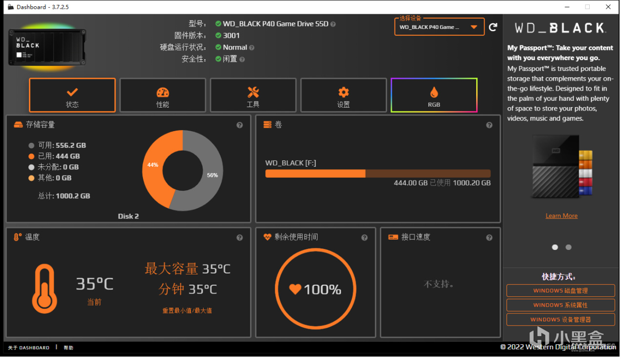 另外,WD_BLACKP40游戏移动固态硬盘不仅拥有强劲的性能,还搭载了 RGB 光效系统。配合西部数据的Dashboard 控制软件,大家不仅能够随时查看该硬盘的各项属性与运行状态,还能对光效自定义设计。通过 Dashboard的调控大家可以让 WD_BLACK P40 完全融入你的整屋光效设计中。