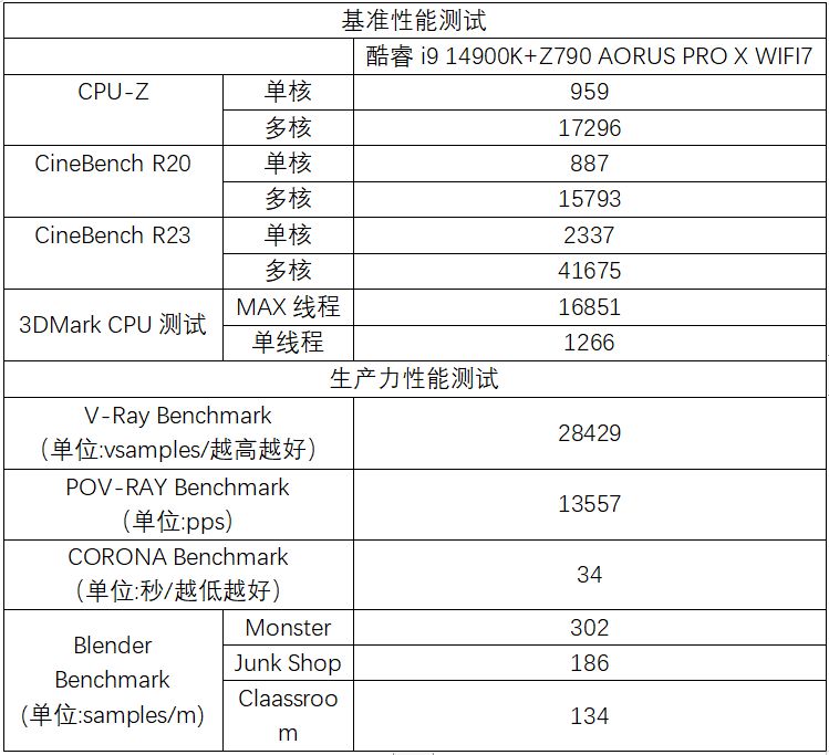 而在处理器基准性能测试中,酷睿i9 14900K处理器在《CPU-Z》《Cinebench R20》《Cinebench R23》中的都展现出了强悍的性能。而在生产力性能方面,酷睿i9 14900K在各种生产力软件中的成绩也非常优秀,技嘉Z790 AORUS PRO X WIFI7主板完全能够旗舰CPU的运行需求。