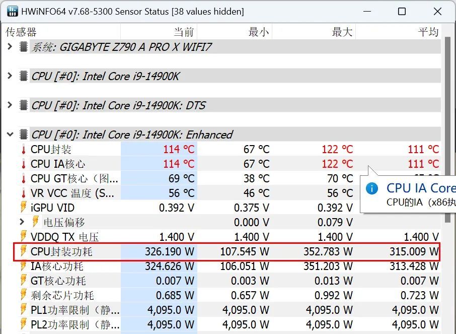 为了验证技嘉Z790 AORUS PRO X WIFI7主板的性能表现,我们选择了当前最顶级的处理器和显卡——酷睿i9 14900K和RTX 4090来打造出一套顶级平台。在解锁功耗墙的情况下使用Cinebench R23考机,此时酷睿i9 14900K的持续满载功率提升到了330W左右,说明处理器性能释放是很充分的。