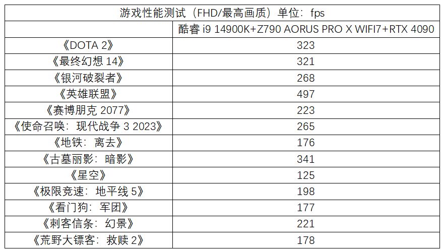 在大家最关心的游戏性能方面,我们选择了十几款热门游戏进行测试。综合款游戏的帧率表现来看,技嘉Z790 AORUS PRO X WIFI7主板搭配酷睿i9 14900K和RTX 4090 顶级游戏平台的表现同样出色,不论是电竞网游还是3A游戏大作的帧率都表现都十分出色,充分发挥了旗舰处理器和显卡的性能,可以为玩家带来非常流畅的游戏体验。