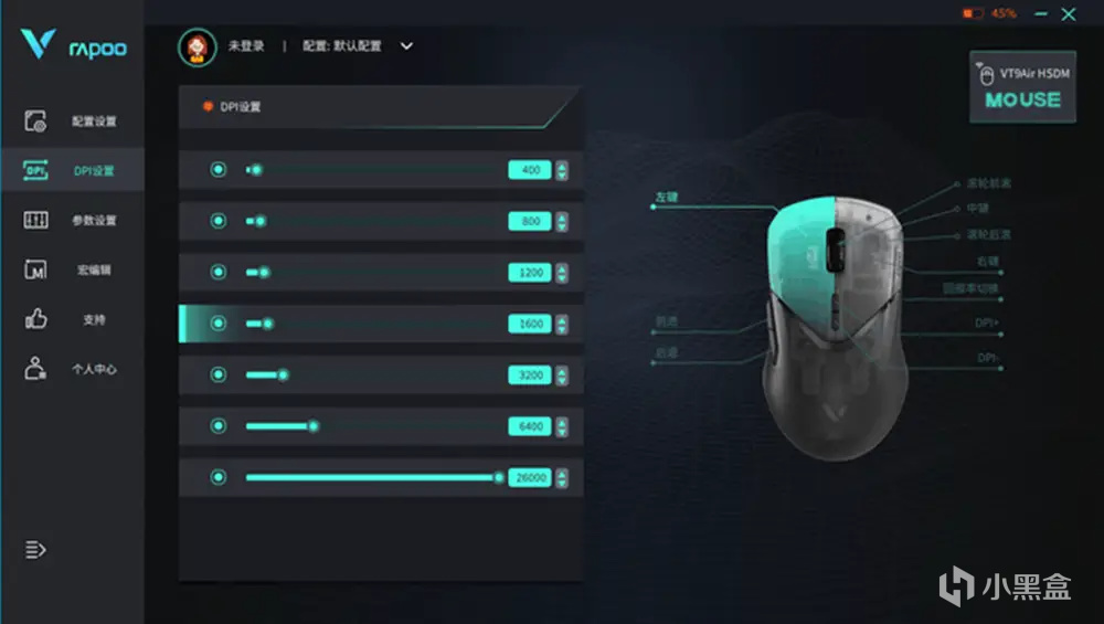 雷柏VT9Air支持有线无线双模式,1+9个自定义按键,通过驱动软件可扩展宏定义编程。具有板载内存,支持将配置智能云存储,通过雷柏V系列智能云存储账号,可以保存多组配置文件,用户的个性化设置配置自动实现匹配,避免反复设置的麻烦。