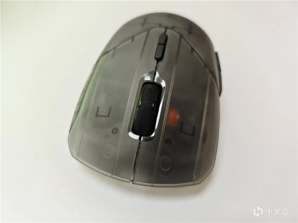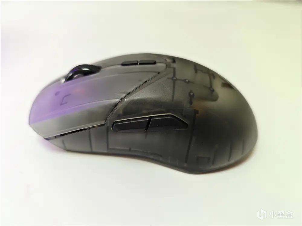 雷柏VT9Air右侧按键旁边预留一个带有品牌LOGO的镜面饰板,提高右键与侧裙连接缝,避免夹肉,让趴握玩家无名指放置更加舒适。