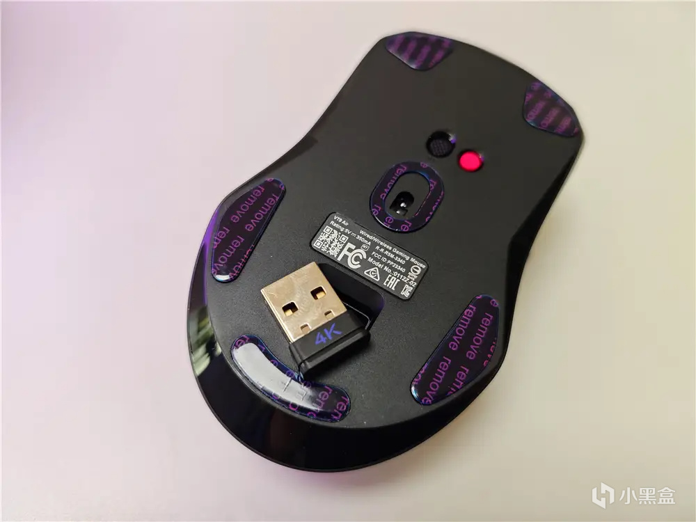 雷柏VT9Air底部中间预留开关键和DIY独立键,默认功能为回报率切换,通过驱动软件自定义按键功能。底部下方预留2.4G接收器磁吸式收纳仓,外出携带或收纳时轻松收纳接收器。