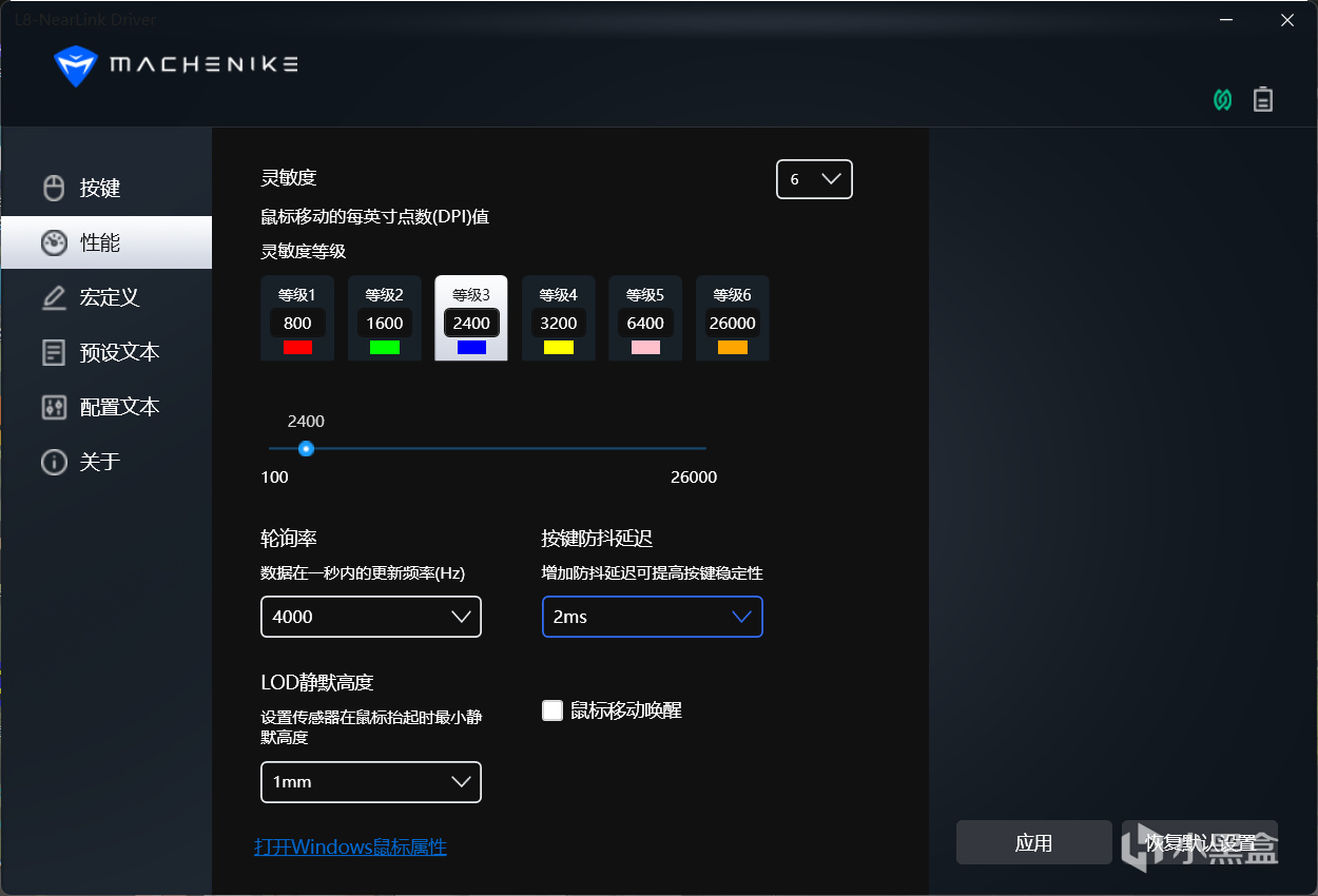 在驱动里可以设置轮询率和按键防抖延迟以及DPI,还有鼠标移动唤醒等基础功能,还有宏程序之类的。这种东西需要真正遇到需要解决的工作时才会用到。臭打游戏的基本无所谓。