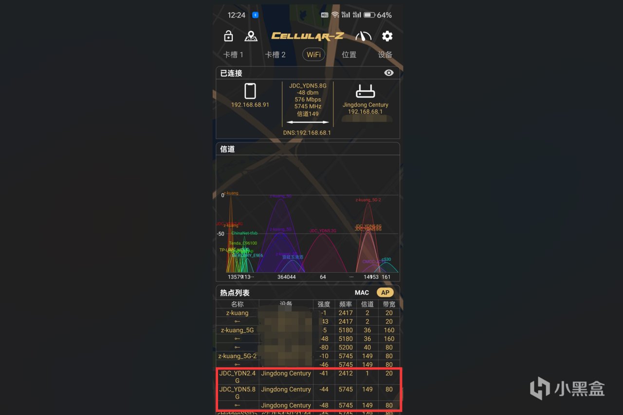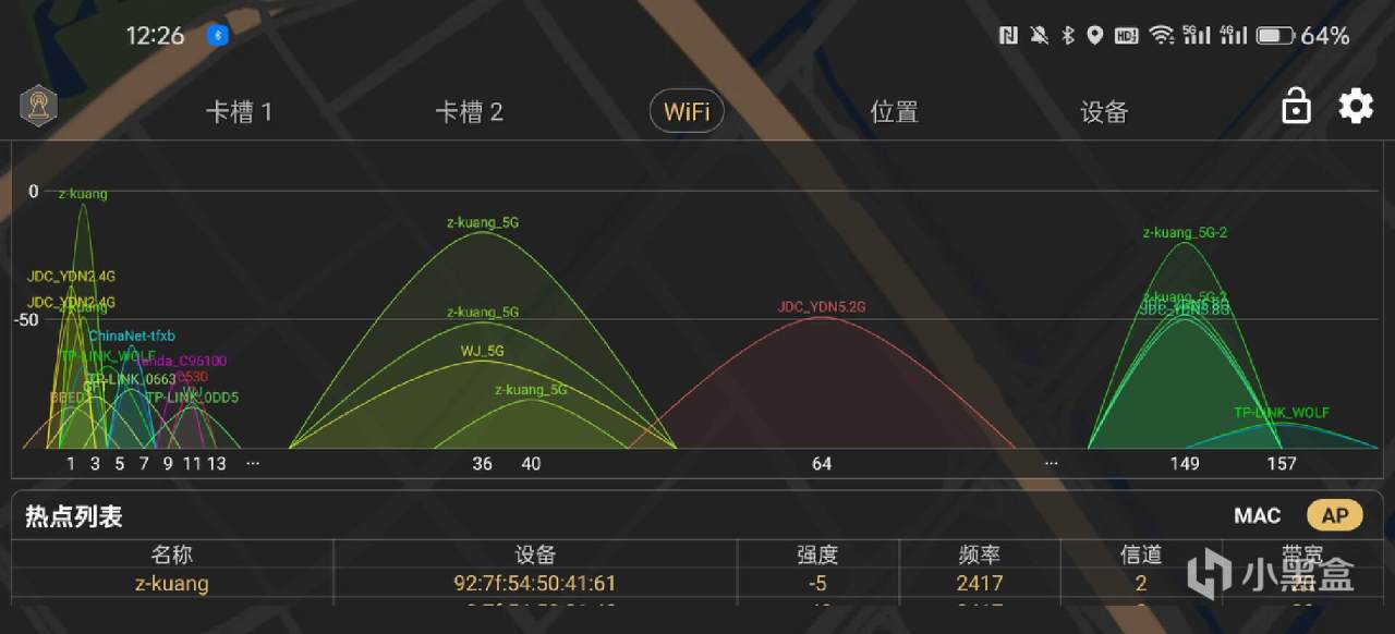 在手机上安装一个Wi-Fi魔盒,就能看出来其他邻居的路由器采用的都是哪些信道了,我们选择其他人使用较少的那个就好。