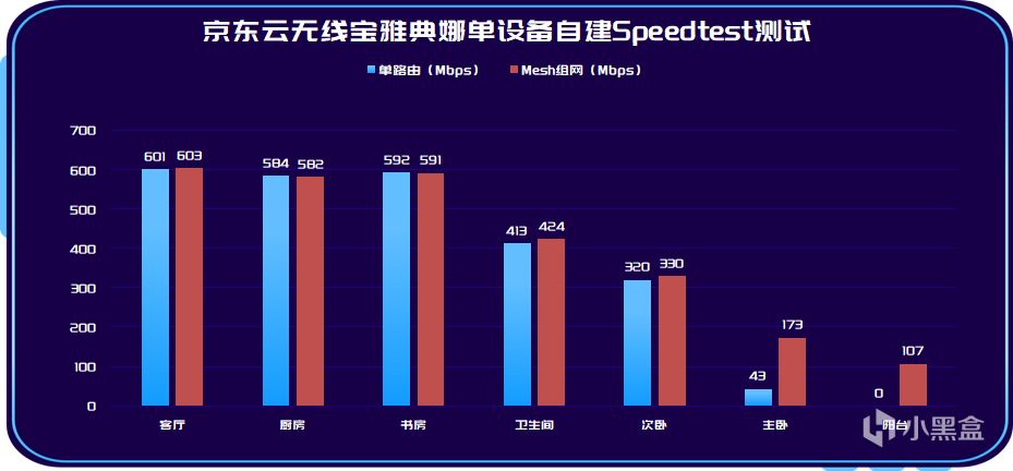 ▼本次MESH组网的主要目的是解决主卧以及阳台的全屋Wi-Fi网络覆盖问题,从结果上也可以看到,像是客厅、卫生间、次卧等原本覆盖效率就很高的位置网络几乎没有变化,最主要的变化集中在我们打算改善的主卧以及阳台位置。