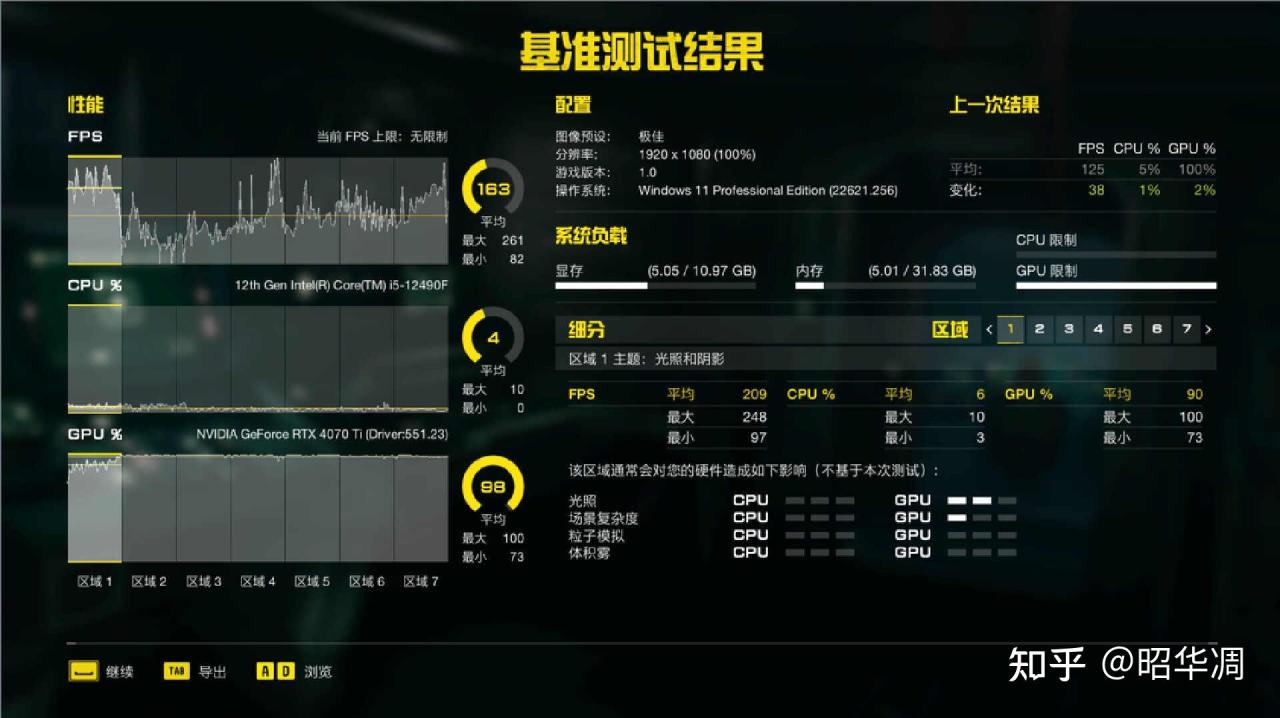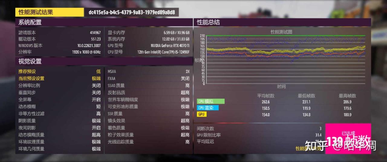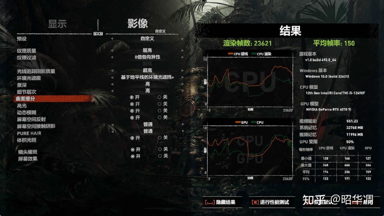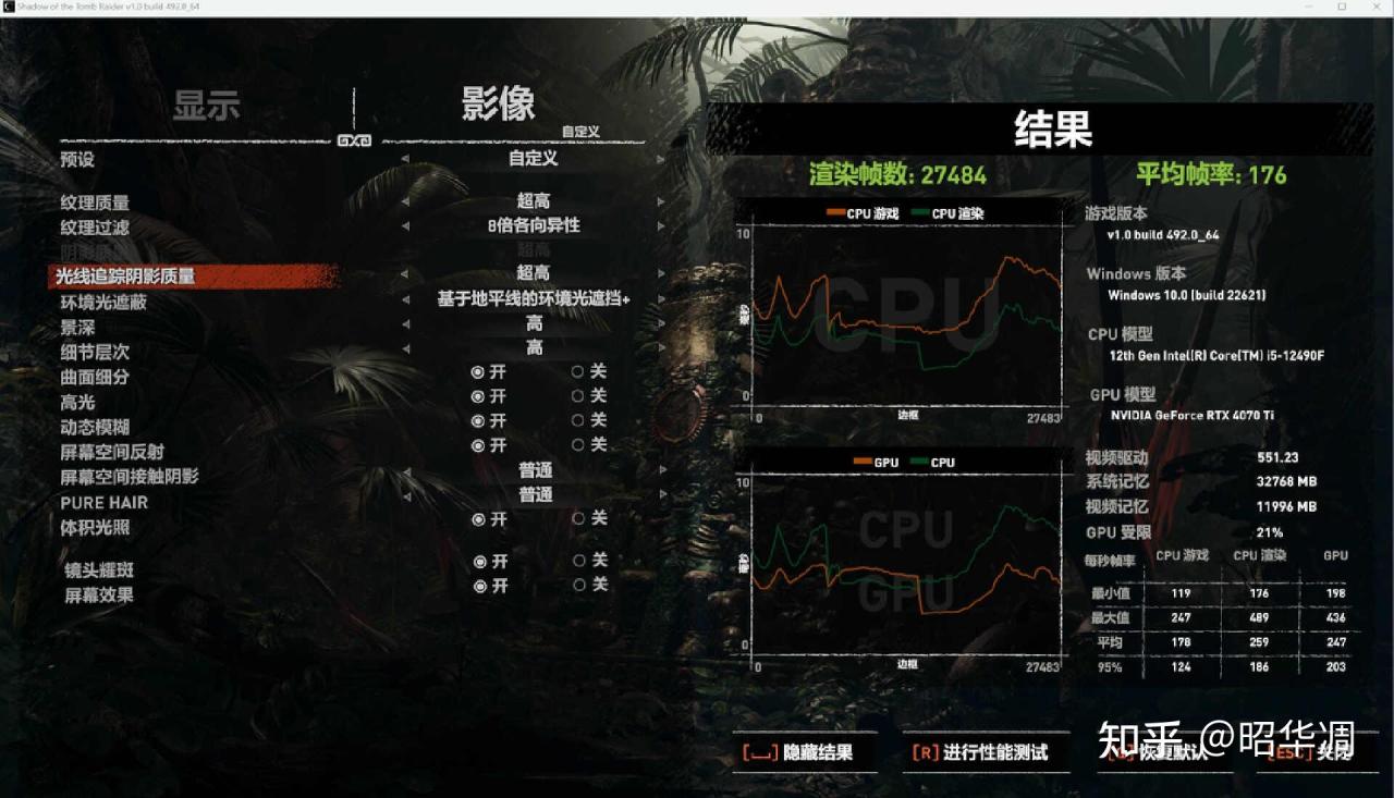 ▼古墓丽影虽然上市有些年头,但详细的 Benchmark 工具,对于判断主机性能还是很实用的,尤其是 CPU 对显卡性能释放的影响详细数据,很适合作为处理器性能测试。从结果来看,在 1080P / 超高性能下主机能跑出 176FPS 平均帧率,不过 21% 的受限率还是说明了 12490F 有点跟不上 GPU 的节奏。