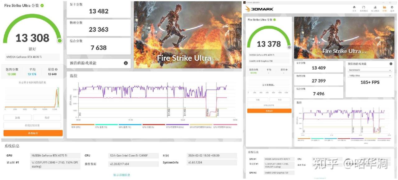 Fire strike Ultra(12490F): 得分 13308分,其中显卡得分 13482分,CPU得分 23363分,综合得分 7638分。