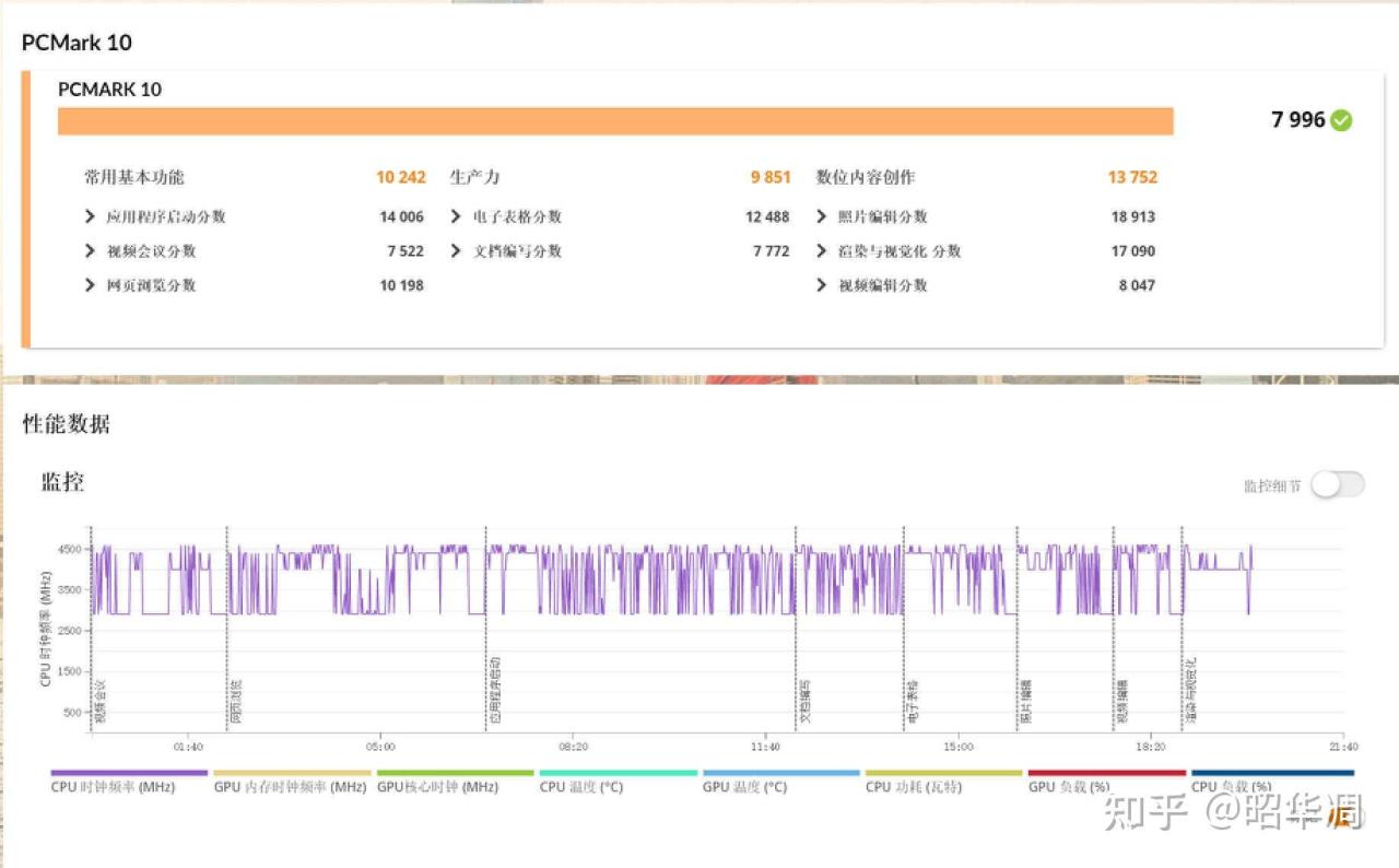 ▼ PC-MARK 是一款专业的计算机处理器性能评估软件,它具备全面的基准测试软件能力,主要用于评估整机综合性能,虽然该软件主要用于生产力测试,但也符合普通用户的需求。测试结果总分 7996,常用基本功能 10242、生产力跑分 9851、数位内容创作 13752。