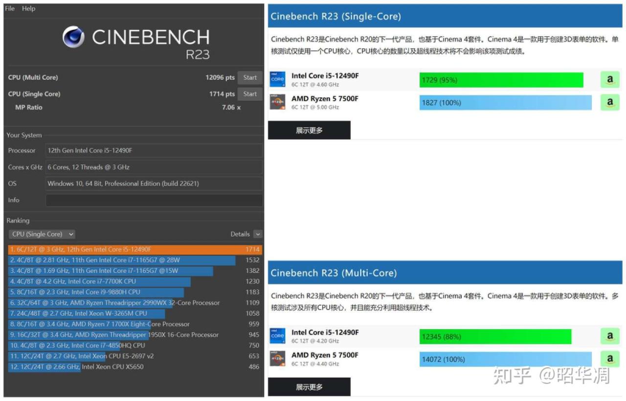 ▼【CINEBENCH R23 】是常见的电脑硬件基准测试软件,主要用于测试 Cinema 4D在多个 CPU 内核上的 3D建模,动画,运动图形和渲染性能,同时能够测试CPU在高负载状态是否稳定运行,台式机或者笔记本的散热能否撑得住长时间的运行等等。最终结果 12490F 单核性能得分 1714pts,多核性能得分 12096pts,