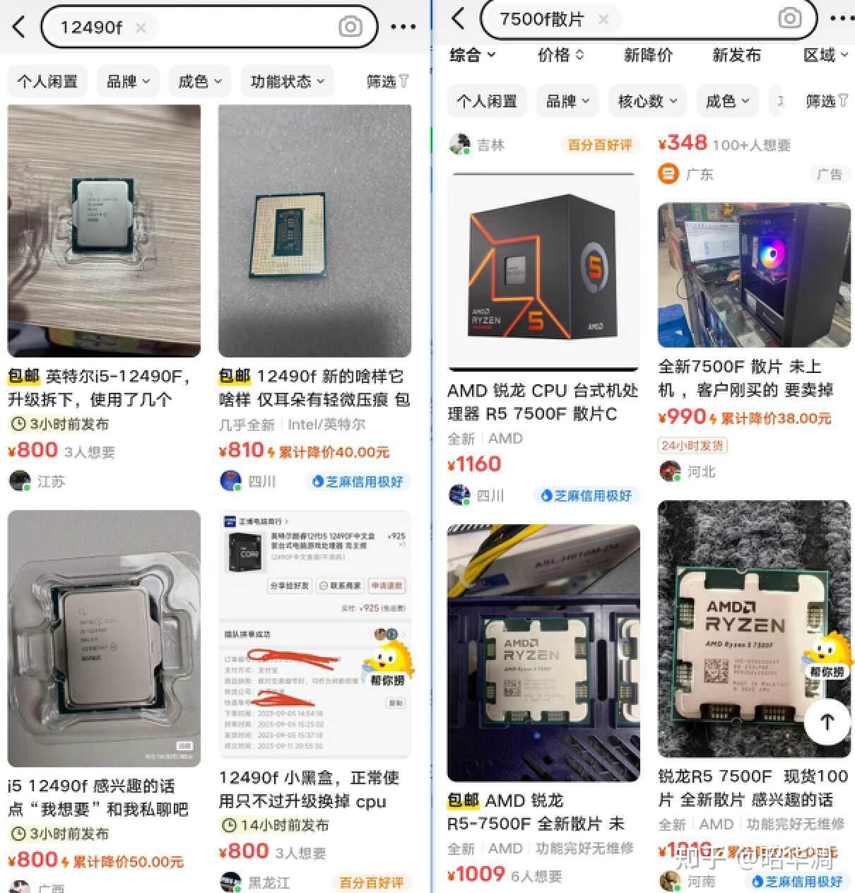 ▼从整体性能来看,新出的 7500F 得益于工艺的提升、频率的加强,性能的确比 12490F 高。但正如对话中所提到的,两款处理器都能满足对方的需求,而 12490F 价格上便宜了 200+,此外 Intel 处理器保值率更高,而且 7500F 也不支持 D4 平台,整体装机费用会更高,这也是我推荐 12490F 的主要原因。