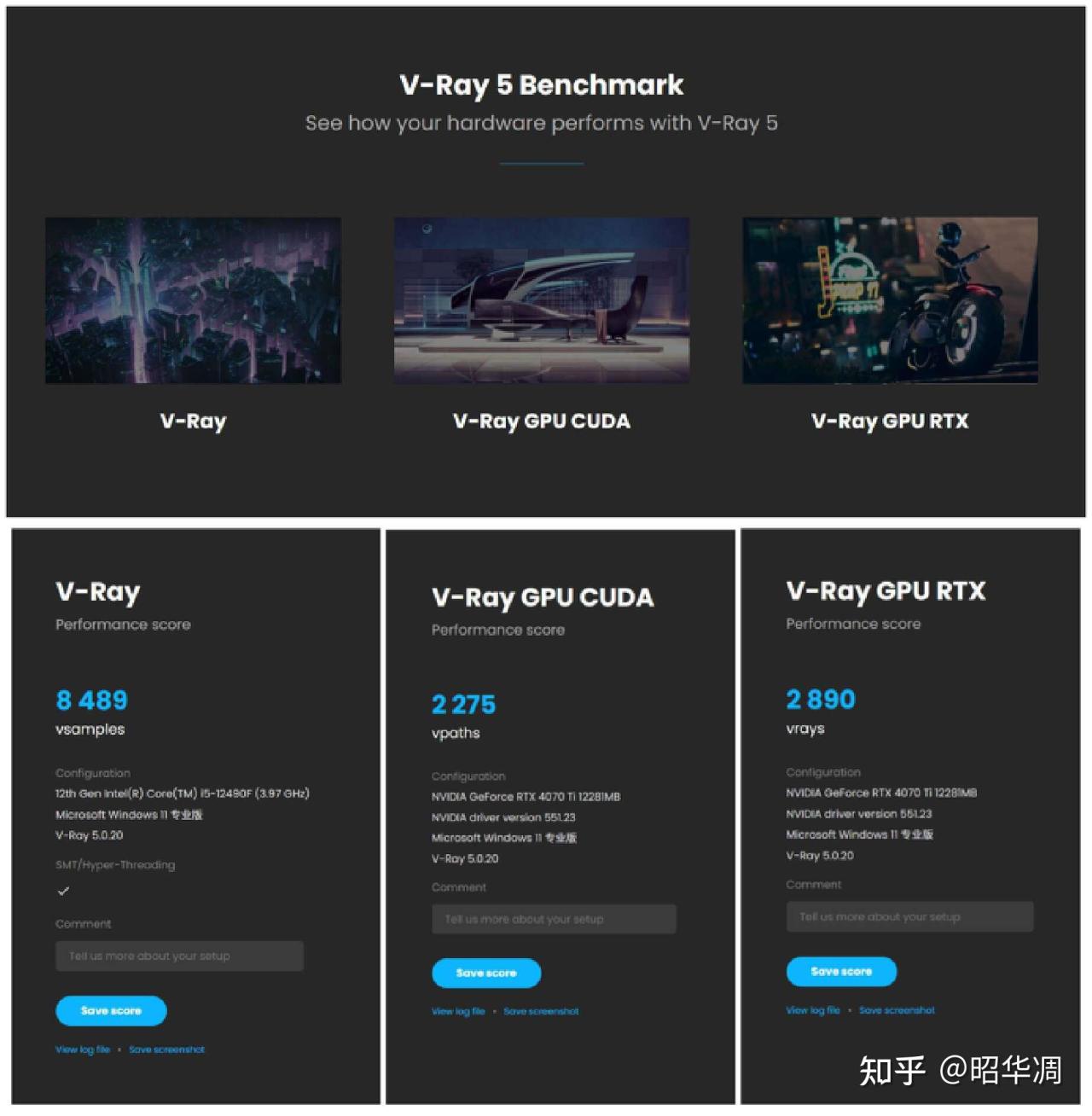 测试结果如下:V-Ray 得分为 8489分, V-Ray GPU CUDA 得分为 2275 分, V-Ray GPU RTX 得分为 2890 分。