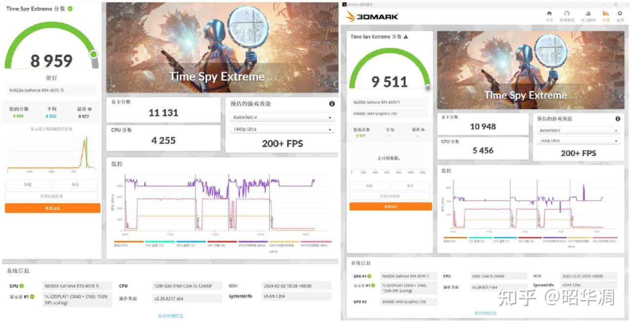 ▼3DMARK 分别测试了 DX11 为基准的 Firestrike Ultra 和 DX12 为基准的 Time Spy Extreme ,两者均为 4K 分辨率。作为对比的是之前测试过的 14400 + B760M + DDR5 7200 32GB 平台,分数如下