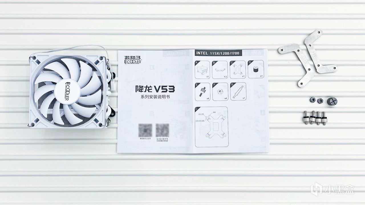 从包装盒里拿出来有:超频三降龙V53W白色款风冷散热器 × 1,安装说明书 × 1, AM4扣具 × 1,AM4固定螺丝 ×1,备用螺帽 × 1,专用螺丝旋拧的螺丝盖帽 × 1。