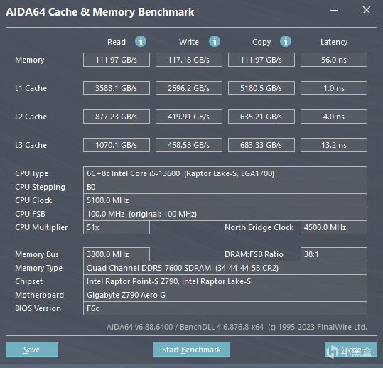 在开启技嘉主板的黑科技(高带宽低延迟)的情况下,手动超频内存跑在DDR5-7600频率下,读取速度:111.97 GB/s,写入速度:117.18 GB/s,复制速度:111.97 GB/s,延迟:56 ns。
